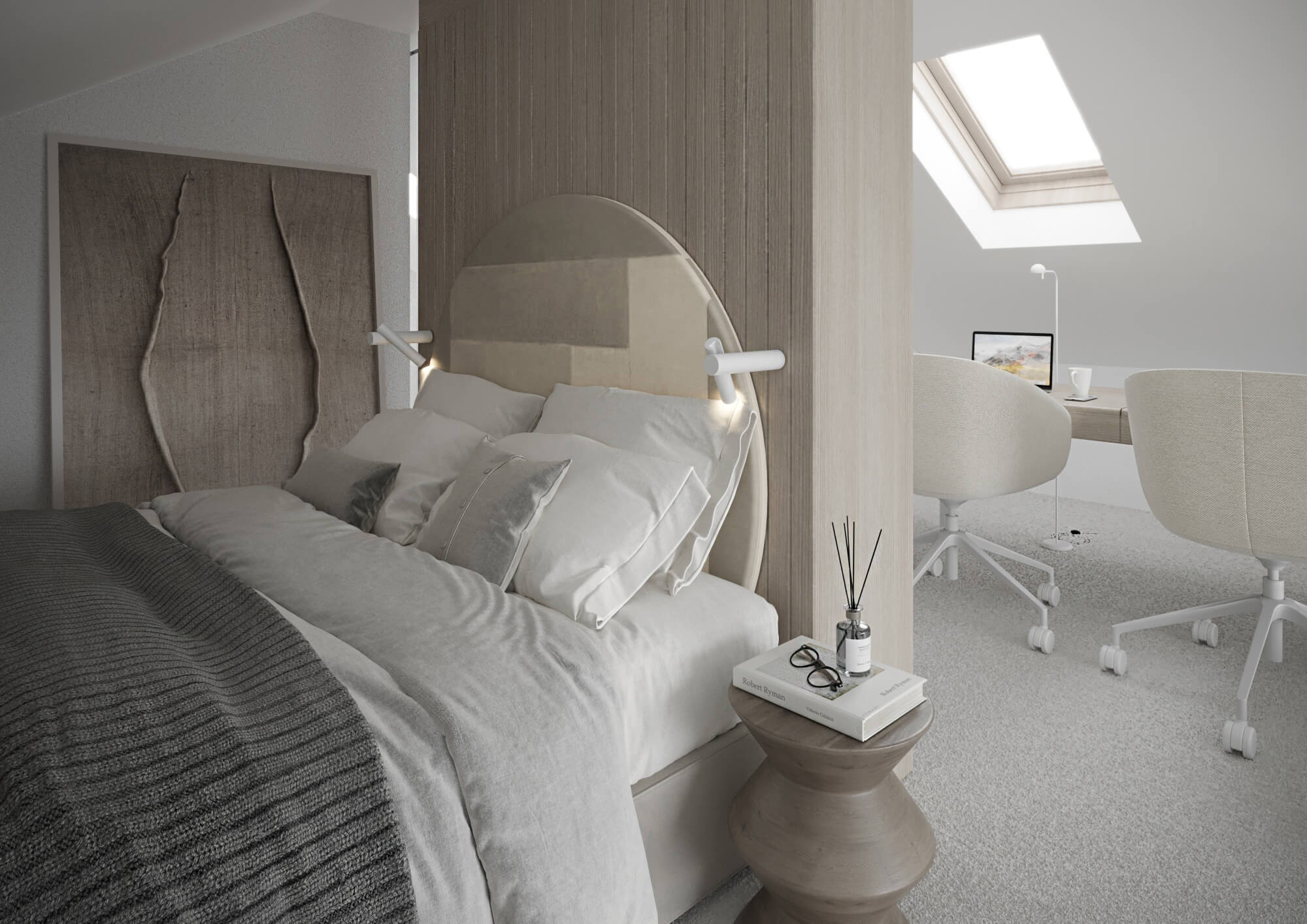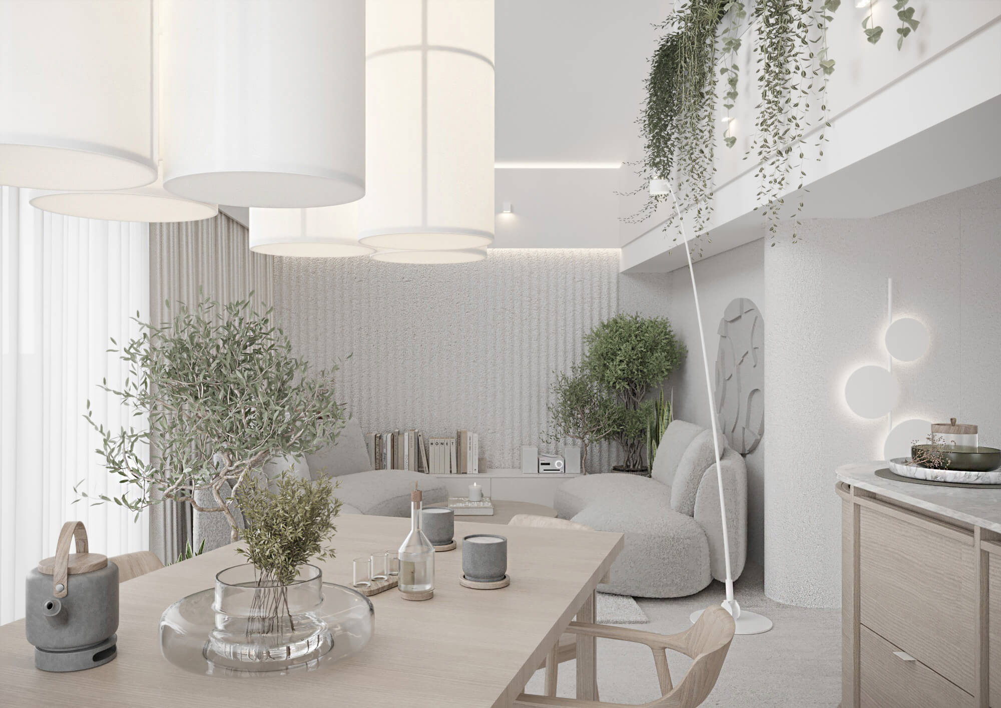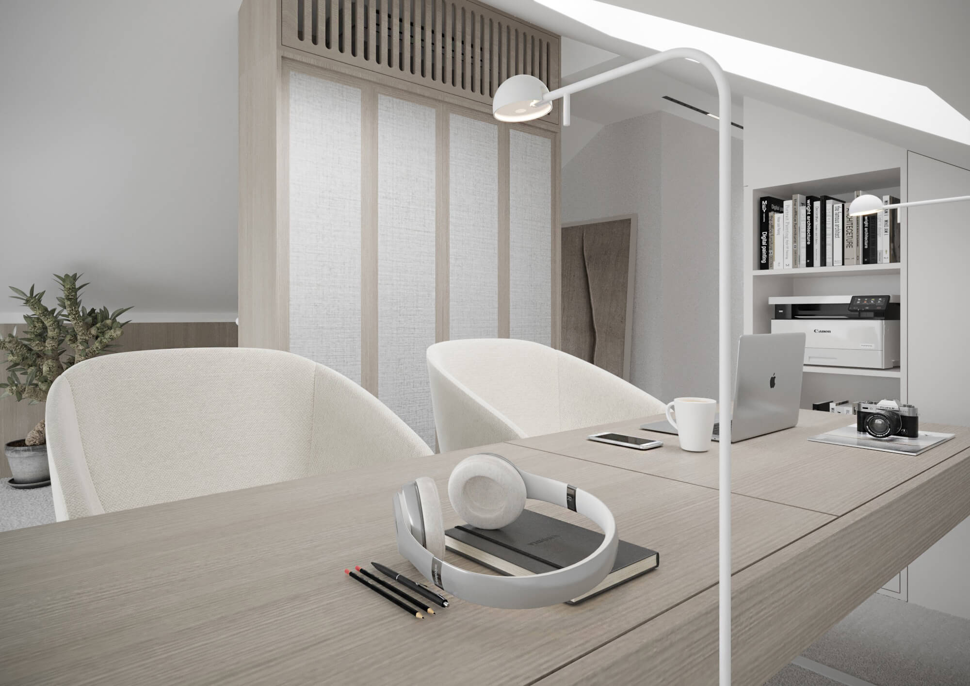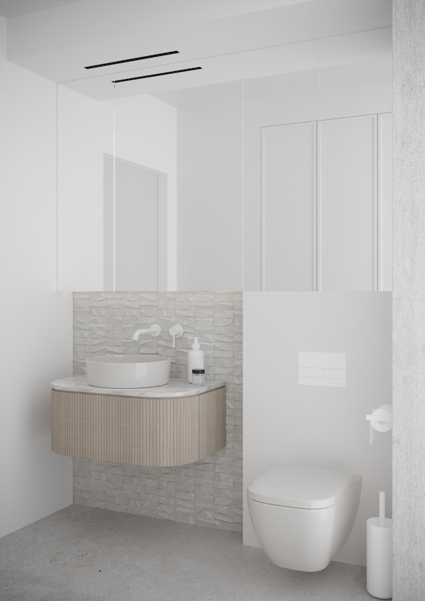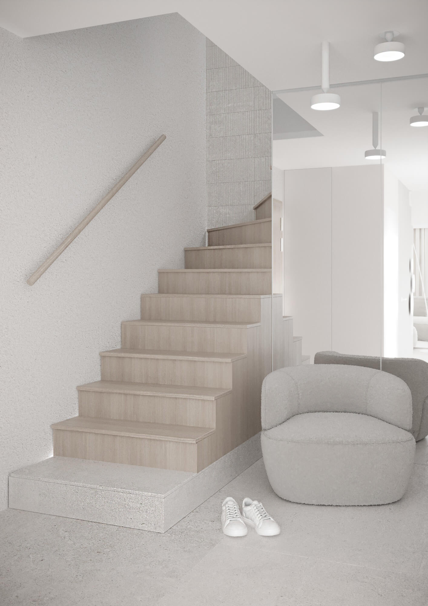 Projekt dwukondygnacyjnego apartamentu zlokalizowanego w podmiejskiej willi wielorodzinnej. Faktury materiałów i okładzin ścian, delikatne linie i naturalna kolorystyka nawiązuje do spokojnego, zielonego, leśnego widoku za panoramicznymi oknami.